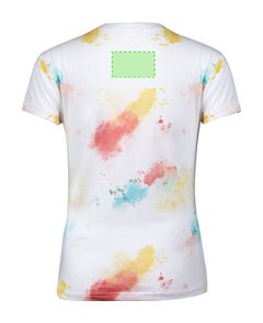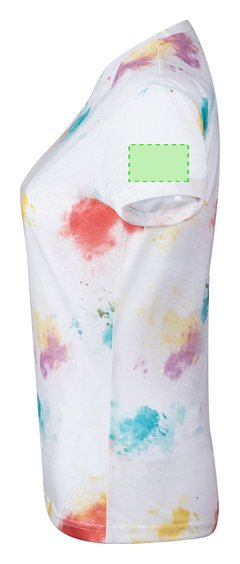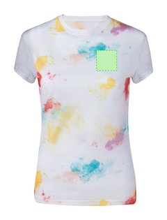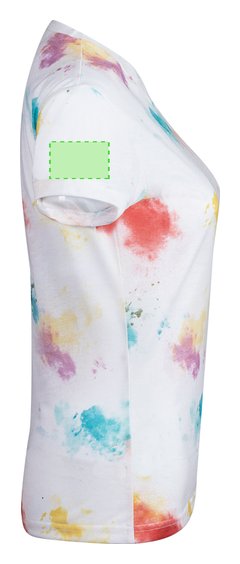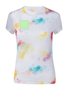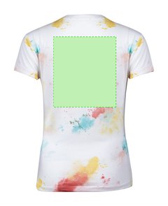 Camiseta para mujer en material 100% poliéster transpirable de 160g/m2 con textura de algodón. Con cuello redondo y atrevido diseño con estampados inspirado en una paleta de pinturas. Disponible en tallas S, M, L, XL.