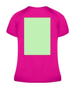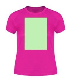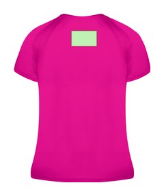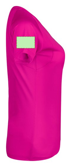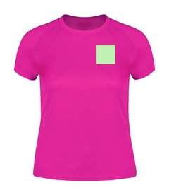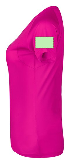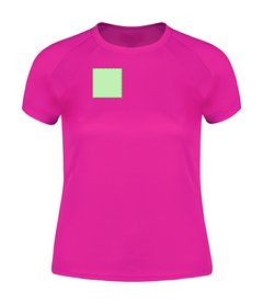 Camiseta técnica para mujer en material 100% poliéster transpirable de 135g/m2. Con manga ranglán, cuello redondo y con bandas frontales y laterales en tejido transpirable microperforado. Disponible en tallas S, M, L, XL.