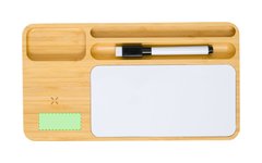 Cargador organizador inalámbrico 15W de línea nature. Con función soporte para smartphone y compartimento extra para objetos. Pizarra para notas integrada y rotulador en tinta negra con borrador en la capucha. Amplia superficie de marcaje y presentado en caja individual de diseño eco en cartón kraft. Disponible manual de instrucciones en español e inglés. Materiales como el bambú fomentan la utilización de materias primas naturales, reduciendo las emisiones contaminantes. Proviene de una planta de gran resistencia y versatilidad, con crecimiento y regeneración rápidos, siendo una excelente alternativa al uso de madera tradicional. Fabricado conforme a los estándares RoHS y en cumplimiento con los siguientes requisitos de seguridad: Sistema de protección contra sobrecalentamiento. Sistema de protección contra sobrecarga. Sistema de bloqueo para evitar cortocircuitos.