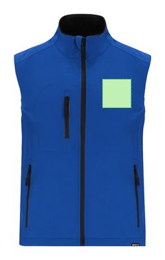 Chaleco Soft Shell RPET confeccionado en 3 capas, de 340 g/m2. Con membrana de 8000mm, impermeable y transpirable. Exterior en Soft Shell e interior en tejido polar microfleece en color negro. Con bolsillo exterior en pecho derecho y dos bolsillos laterales con cremalleras. Con cremallera central y cremalleras invertidas en bolsillos, incluyendo tiradores de cordón en color negro. Cuenta con protector de barbilla a juego y cintura ajustable, con cordón elástico y tope. Distintivo RPET en el ribete de la prenda.