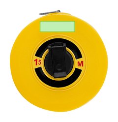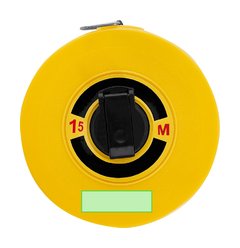 Cinta métrica 15 metros de largo en estuche PP y mecanismo en manivela. Escala impresa en cinta de PVC en negro para cm, y rojo para las pulgadas.