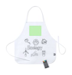 Delantal fabricado en non-woven RPET de color blanco, especialmente diseñado para colorear con ceras. Incluye 5 ceras en variados colores. Con cintas de ajuste en cuello y cintura. Distintivo RPET en etiqueta exterior. El material RPET se elabora a partir de plástico reciclado, para así fomentar la reutilización de residuos plásticos y ayudar a la sostenibilidad del planeta.