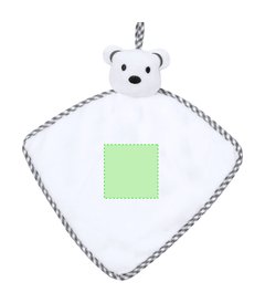 Tierno doudou con lindo diseño de osito blanco. Fabricado en una única pieza de tela, para evitar que se separe en trozos más pequeños. Con bordes reforzados en tela bicolor y práctica asa de transporte.