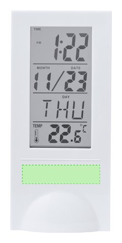 Estación meteorológica fabricada en resistente ABS, con sensor de temperatura. Función de hora (12/24), calendario, alarma y día de la semana. Con base soporte y botones de control traseros. Alimentación a pilas (2xAAA no incluidas) y presentada en atractiva caja de diseño kraft. Disponible manual de instrucciones en español e inglés.