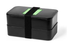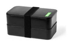 Fiambrera de 1,4 l de capacidad, fabricada en PP libre de BPA. Dos compartimentos, cada uno de 700 ml de capacidad. Compartimentos interiores con tenedor, cuchara, cuchillo y separadores. Disponible en variada gama de colores, con cinta elástica de seguridad a juego. Certificación Food Grade, garantizando la seguridad cuando los alimentos entran en contacto con el material usado para fabricar el producto.