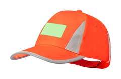 Gorra de 5 paneles en suave poliéster. Cierre de velcro reflectante ajustable en la parte trasera. En color amarillo flúor o naranja con detalles reflectantes en visera, parte frontal y trasera.