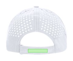 Gorra de 5 paneles en microfibra, parte trasera con diseño perforado, para óptima transpirabilidad y cierre ajustable de velcro.
