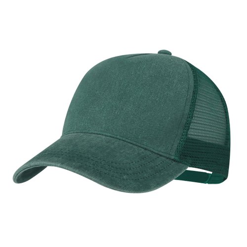Gorra de 5 paneles de acabado efecto lavado. Fabricada principalmente en suave algodón, parte trasera en tejido de malla en mismo color. Ideal para el día a día gracias a su práctica transpiración. Con cierre plástico trasero ajustable.