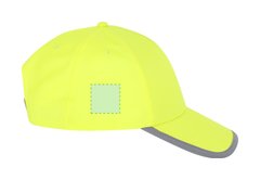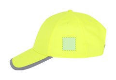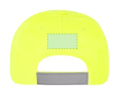 Gorra infantil deportiva en suave poliéster de diseño bicolor en amarillo fluorescente con reflectante perfil en la visera y en cierre. Cierre de velcro y orificios de ventilación bordados.