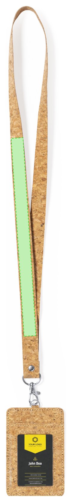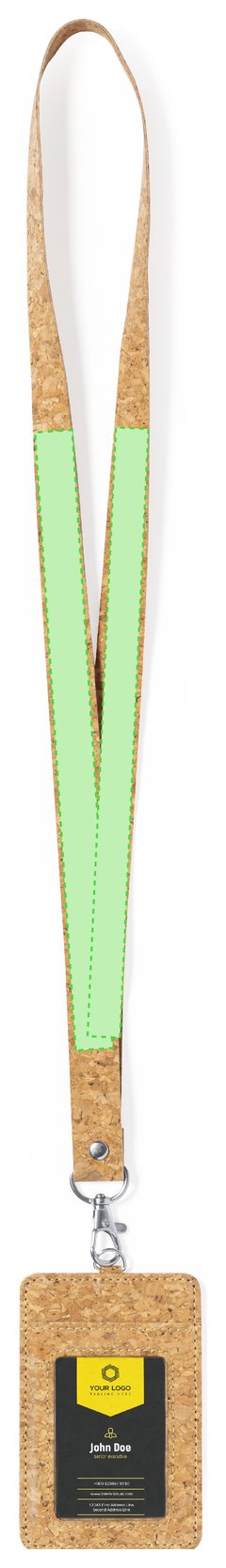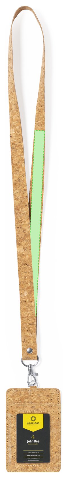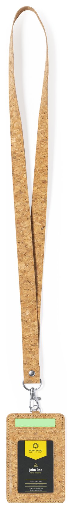 Identificador lanyard fabricado en corcho. Suave cordón hecho con corcho natural con cierre de mosquetón giratorio y un portatarjetas con ventanilla de PVC. Elaborado con elementos vegetales para así fomentar la utilización de materias primas naturales y reducir las emisiones contaminantes.