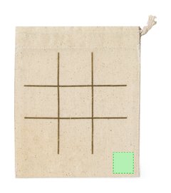 Juego tres en raya fabricado en corcho natural. Incluidas 5 fichas circulares y 5 fichas en cruz. Presentado en bolsa de algodón con cierre de cordón que sirve como tablero para jugar.
