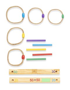 Juego de puntería fabricado en madera. Consiste en colar los aros de cuerda en la base con palos del mismo color (cada color tiene una puntuación diferente). Compacto y cómodo de montar, incluye 12 piezas. Con instrucciones en español e inglés. Presentado individualmente en una caja de diseño kraft.