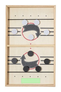 Divertido juego de mesa fabricado en madera e ideal para los más competitivos. El juego consiste en lanzar las fichas desde cada campo al capo contrario usando el elástico. Gana el que más fichas cuele por la ranura del oponente. Tablero con 5 fichas blancas y 5 negras, presentado en una caja individual de diseño kraft.