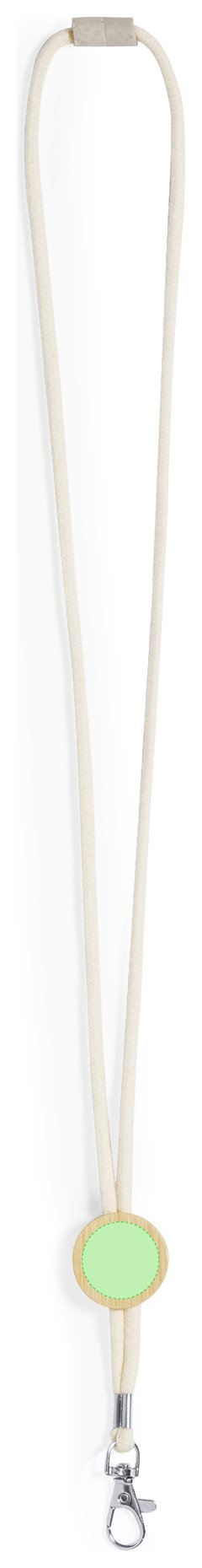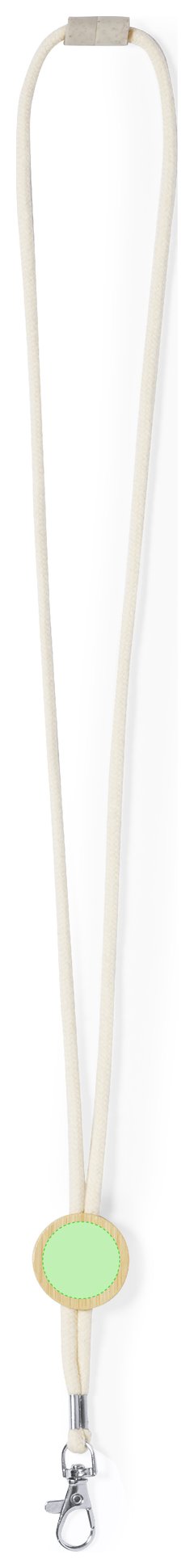 Lanyard fabricado en resistente algodón 100% y bambú. Accesorio circular especial para la personalización de bambú y cierre de seguridad en cuello fabricado en caña de trigo, con mosquetón metálico giratorio. Materiales como el bambú fomentan la utilización de materias primas naturales, reduciendo las emisiones contaminantes. Proviene de una planta de gran resistencia y versatilidad, con crecimiento y regeneración rápidos, siendo una excelente alternativa al uso de madera tradicional.