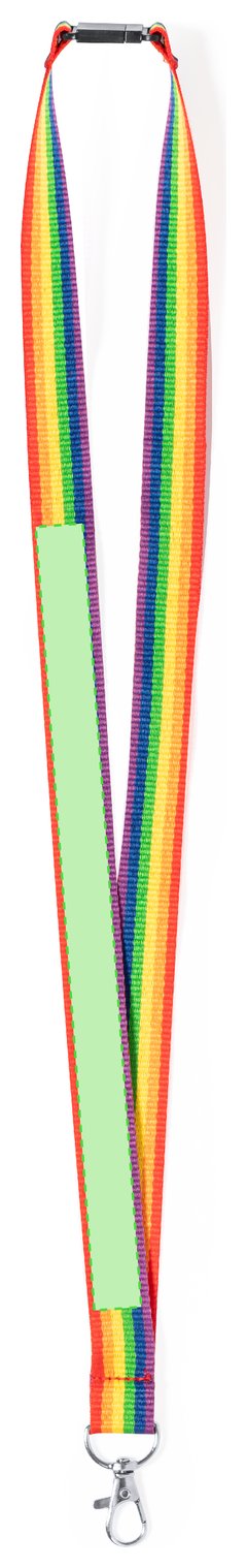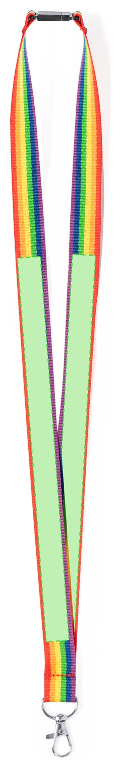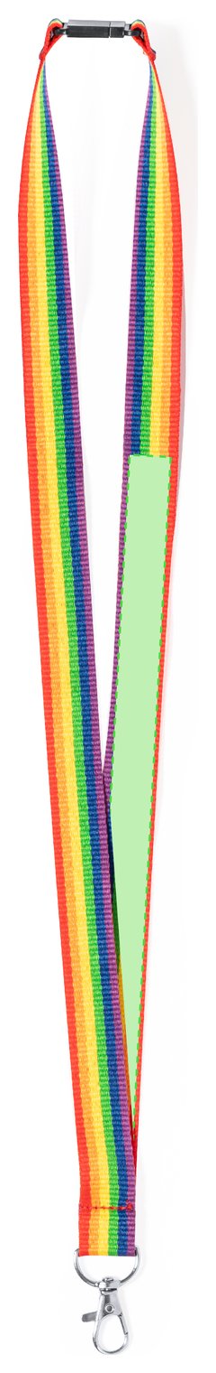 Lanyard Rainbow multicolor, fabricado en suave poliéster. Con mosquetón metálico giratorio y accesorio de seguridad en el cuello. Todo un orgullo de lanyard.