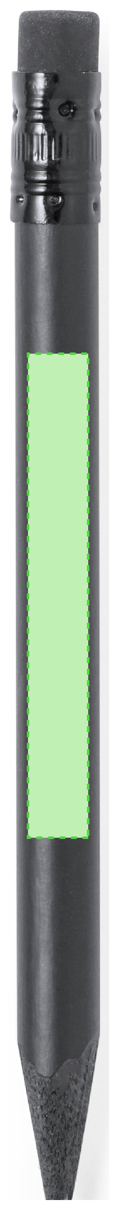 Lápiz de madera natural en acabado negro mate, con mina negra, punta afilada y goma en la parte superior a juego.