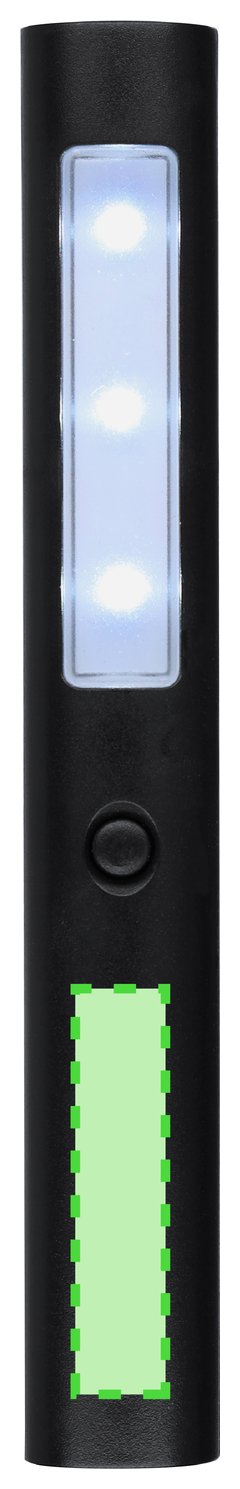 Linterna de 3 LEDs con resistente cuerpo en ABS, con pulsador en el frontal y prácticos imanes en la parte trasera. Alimentación a pilas de botón incluidas.