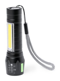 Potente linterna con batería recargable, fabricada en aluminio de acabado en color negro. Luz frontal con 1 LED y cabezal regulable, para tener un enfoque más focalizado o abierto. Además, cuenta con 10 luces COB en el mango y tres modos de iluminación (fija e intermitente de dos velocidades), incluye cinta de trasporte. Se alimenta mediante una batería recargable de 400 mAh, incluido cable micro USB. Presentada individualmente en caja de diseño.