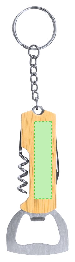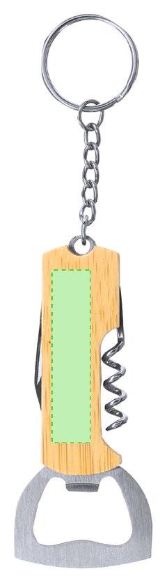 Llavero abridor fabricado en bambú y acero inox, con abridor de botellas y sacacorchos, incluye cuchilla y argolla de metal para llaves.Materiales como el Bambú fomentan la utilización de materias primas naturales reduciendo las emisiones contaminantes. Además, el bambú proviene de una planta de gran resistencia y versatilidad, con crecimiento y regeneración rápida, siendo una excelente alternativa al uso de madera tradicional.
