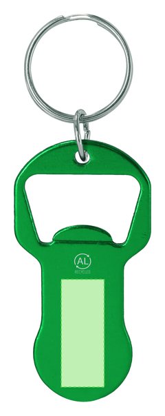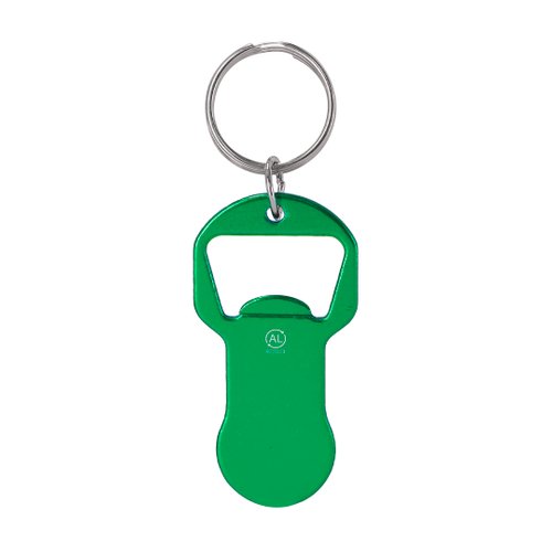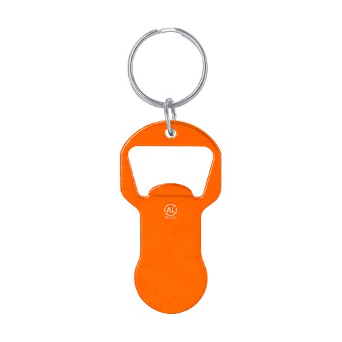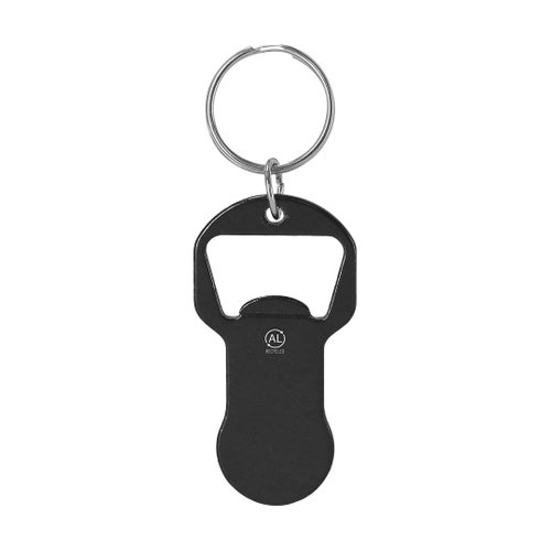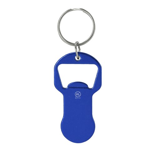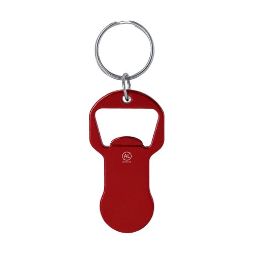 Llavero moneda abridor de Aluminio Reciclado con acabado metálico brillante. En la parte superior función abridor de botellas y en la parte inferior moneda integrada para una doble funcionalidad. Incluye logotipo Aluminio Reciclado.