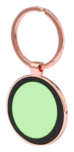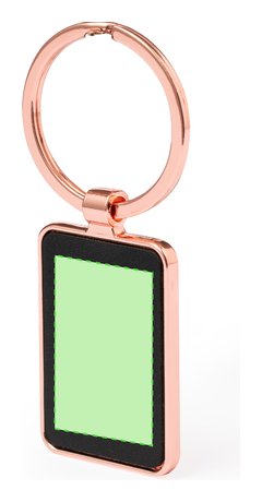 Llavero metálico de sofisticado diseño, con recubrimiento de cobre galvanizado y acabado brillo. Forrado en elegante polipiel en una de sus caras y disponible en diseño rectangular y circular. Presentado individualmente bolsa de papel reciclado.
