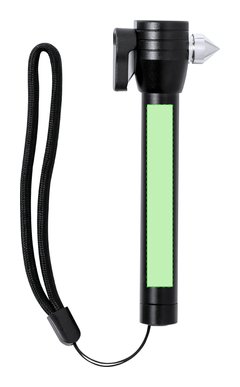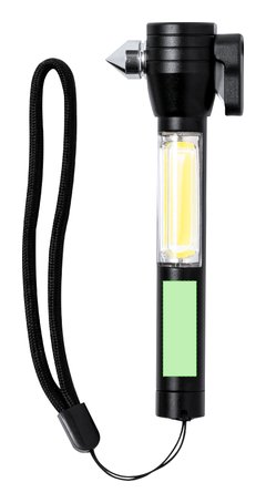 Versátil martillo de emergencia. Cuenta con tres funciones: una potente linterna con 6 luces COB alimentadas por pilas de botón (incluidas), una punta metálica rompecristales y una cuchilla cortacinturones. Zona imantada en parte superior y tira para una mejor sujeción. Presentado en caja individual kraft.