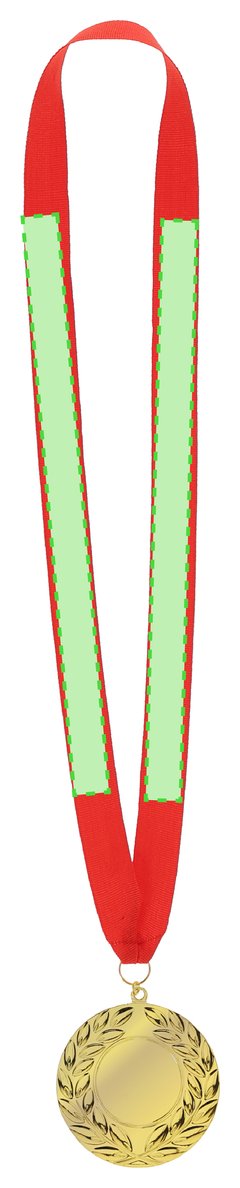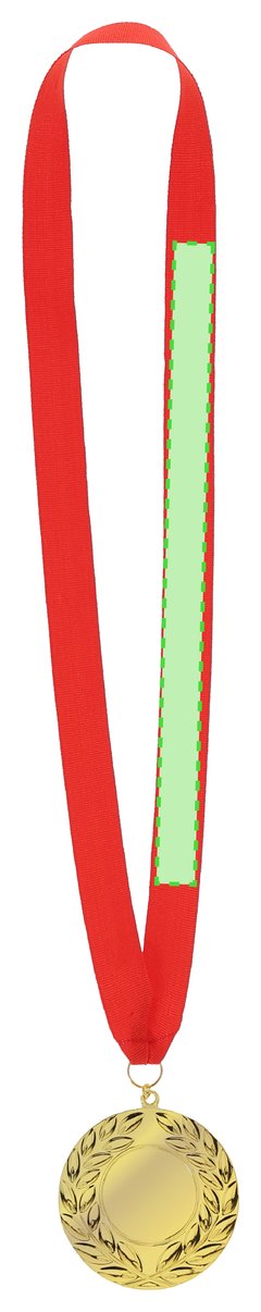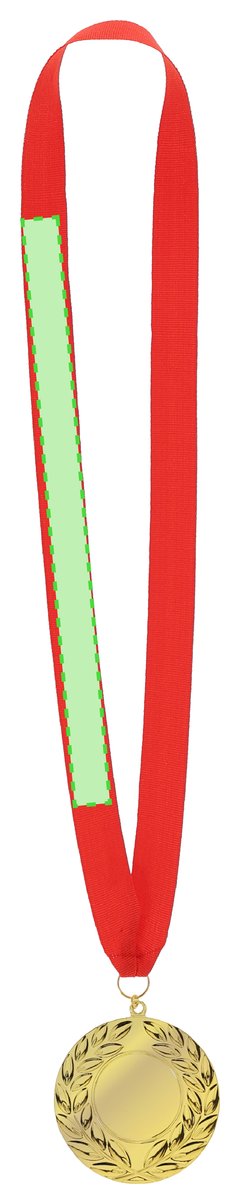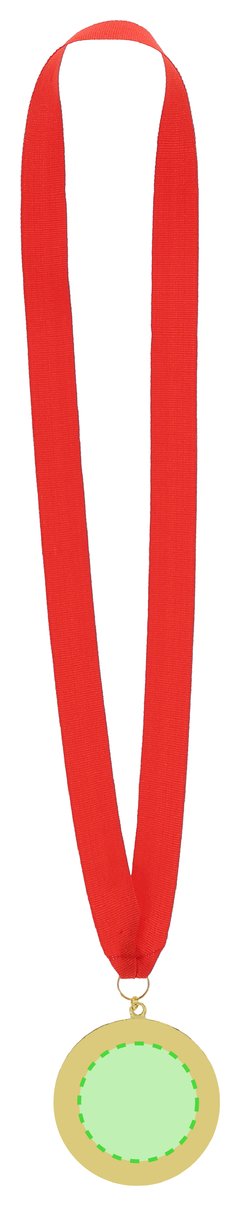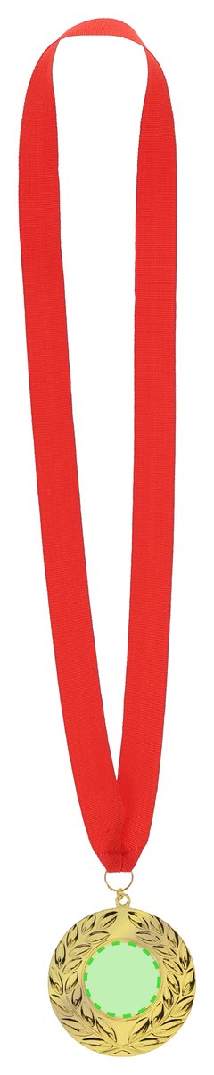 Medalla metálica de acabado dorado en relieve de 7cm de diámetro. Con cinta de poliéster en color rojo, anilla metálica a juego y especialmente diseñada para marcaje en láser.