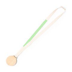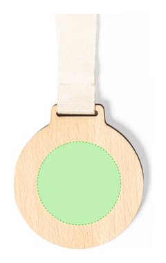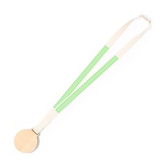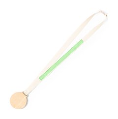 Medalla de línea nature fabricada en madera natural. Cordón fabricado en 100% algodón, con cierre de seguridad de fibra de trigo en el cuello.
