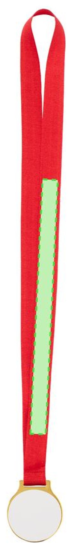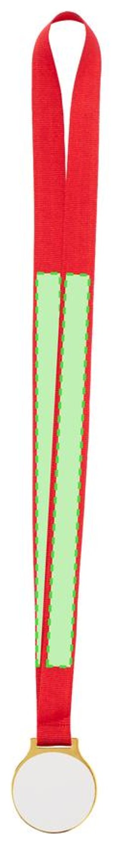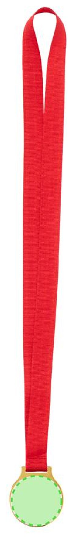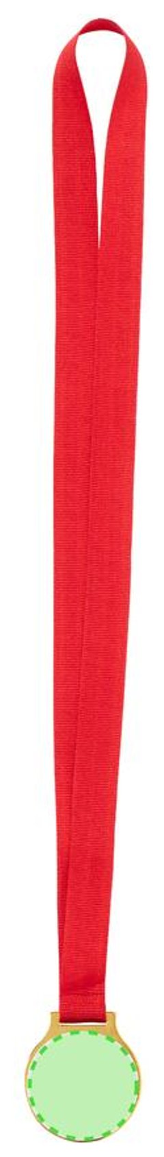 Medalla metálica con acabado dorado liso, especialmente diseñada para marcaje en sublimación (no integrada en el producto, ideal para imprimir y pegar posteriormente). Cinta de poliéster en color rojo incluida.