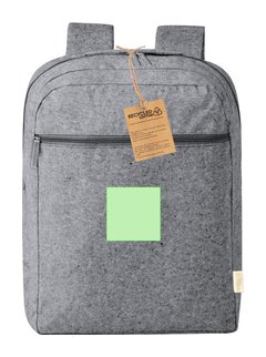 Mochila fabricada en algodón 100% reciclado GRS de 300g/m2. Cuenta con compartimento principal y bolsillo frontal con cierre de cremallera. Incluye asa de transporte y cintas para hombros ajustables a juego, acolchadas para mayor comodidad. Disponible en una variada gama de colores y con logotipo algodón reciclado en la etiqueta exterior. Disponible certificación GRS (Global Recycled Standard / Estándar de Reciclaje Global), que garantiza el origen reciclado del material usado para fabricar el producto.