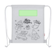 Mochila infantil con motivos navideños fabricada en non-woven RPET. Especialmente diseñada para colorear con ceras. Con 4 ceras en variados colores. Cuenta con cuerdas de autocierre y sujeciones de tela. Incluye distintivo RPET en etiqueta.El material RPET se elabora a partir de plástico reciclado, para así fomentar la reutilización de residuos plásticos y ayudar a la sostenibilidad del planeta.