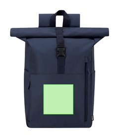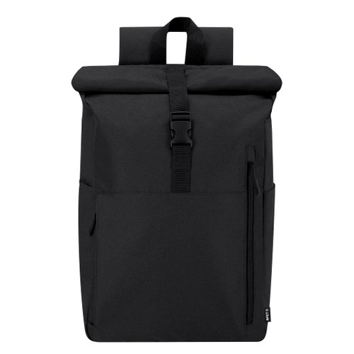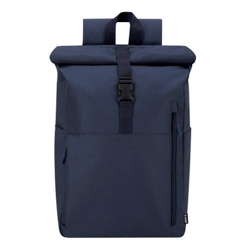 Mochila confeccionada en resistente RPET 300D. Con sistema de cierre enrollable y hebilla. Dispone de dos bolsillos frontales, un bolsillo trasero con acceso lateral y dos bolsillos laterales adicionales. Interior de gran capacidad con compartimento interior acolchado para portátil de hasta 15 pulgadas. Cintas de hombros y espalda acolchachadas. Incluye cinta de transporte para ajuste en trolley o maleta, ideal para viajes y desplazamientos. El material RPET se elabora a partir de plástico reciclado, para así fomentar la reutilización de residuos plásticos y ayudar a la sostenibilidad del planeta.
