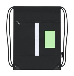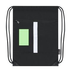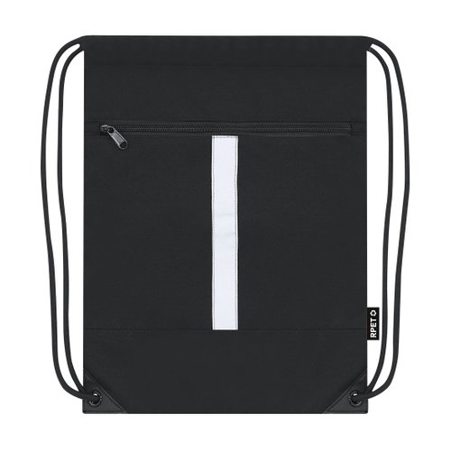 Mochila reflectante en Poliéster 300 RPET, con tira frontal reflectante. Cuenta con bolsillo en parte frontal. Cuerdas autocierre en color negro y esquinas reforzadas con argollas metálicas.