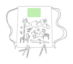 Mochila de non-woven en color blanco especialmente diseñada para colorear con ceras. Incluye 5 ceras de cuerpo cilíndrico en variados colores. Con cuerdas autocierre en color negro y refuerzo en las esquinas.