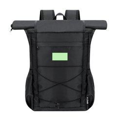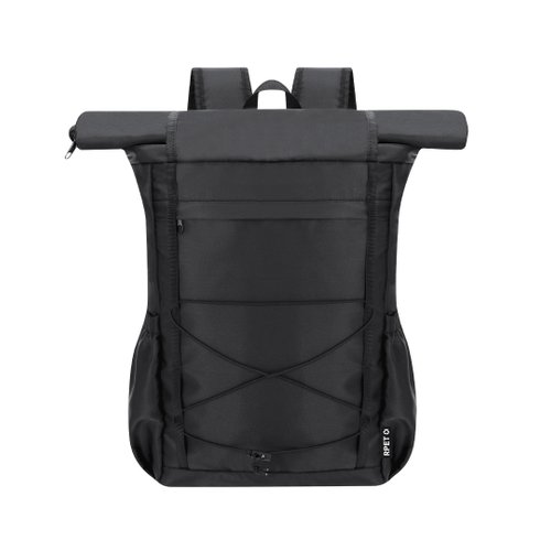 Mochila confeccionada en poliester RPET 290D con sistema de cierre enrollable de cremallera y un segundo cierre de velcro. Dispone de un bolsillo frontal con cremallera invisible, así como cuerda elástica ajustable en el frontal. Dos bolsillos laterales adicionales. Interior de gran capacidad con compartimento acolchado para portátil de hasta 15 pulgadas. Cintas de hombros y espalda acolchadas para mayor comodidad. Logotipo RPET en etiqueta exterior.