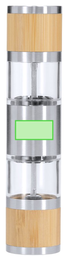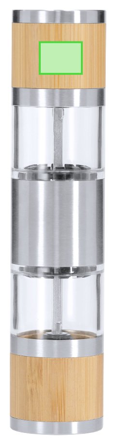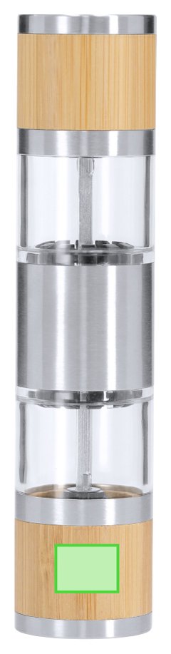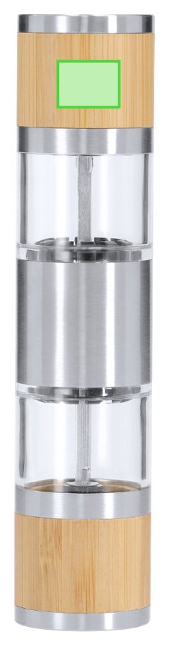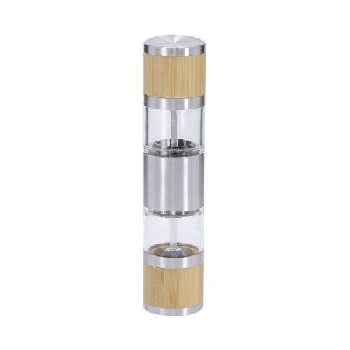 Molinillo manual para sal y pimienta fabricado en Bambú y Acero Inoxidable. Incluye dos compartimentos separados para sal y pimienta, cada uno con molinillo cerámico interno y ajuste manual de grosor. Cuenta con una ventana para visualizar el nivel.