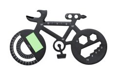 Original y práctica multiherramienta en acero inox con forma de bicicleta. Con 16 funciones, entre otras: destornillador de punta plana y philips, llave para tuercas hexagonales en varios tamaños, regla, transportador de ángulos y abrebotellas. Presentada en bolsa de papel reciclada.