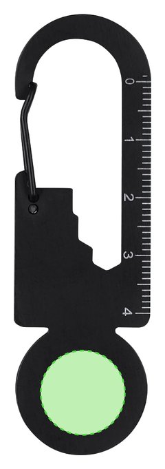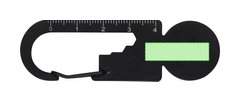 Multiherramienta de acero inoxidable y acabado negro mate. Diseñada para adaptarse a múltiples necesidades, incluye 8 funciones: llave para tuercas hexagonales en varios tamaños, regla para mediciones, abrebotellas, moneda para carro de compra, etc. Con cierre de mosquetón.