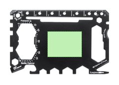 Multiherramienta con resistente cuerpo en acero inox y 17 funciones. Entre otras, funciones abrelatas, cuchillo, destornillador, regla, abrebotellas, llave inglesa, llave de mariposa y transportador de ángulos.