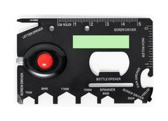Práctica multiherramienta fabricada en acero inox y acabado en negro. Diseño plano en forma de tarjeta y con 16 funciones: destornilladores planos, abridor de cartas, regla en cm y pulgadas, abridor de botellas, abrelatas, pelador, llave para tuercas hexagonales en varios tamaños y linterna (pila de botón incluida). Presentada en bolsa individual diseño en papel reciclado.