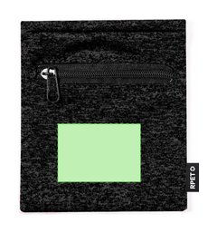 Práctica muñequera en suave poliéster RPET. Complemento perfecto para guardar pequeños objetos gracias a su bolsillo con cierre de cremallera negra. Disponible en variada gama de colores, con etiqueta distintiva RPET. El material RPET se elabora a partir de plástico reciclado, para así fomentar la reutilización de residuos plásticos y ayudar a la sostenibilidad del planeta.