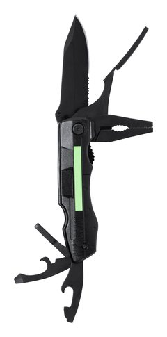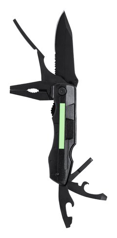 Navaja multiusos de acabado negro en acero inoxidable y resistente empuñadura a juego en aluminio. De diseño plegable y tamaño compacto. Incluye 10 funciones: - Destornillador con múltibles cabezales- Cuchillo de filo liso y dentado-Abrebotellas- Abrelatas- Alicates con cortador de hilosPresentada en práctico estuche de poliéster a juego con accesorio para cinturón.