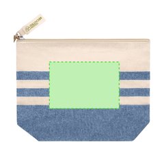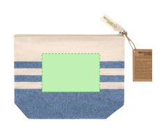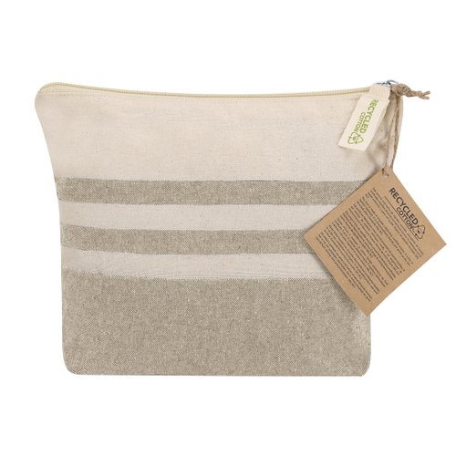 Neceser fabricado principalmente en algodón reciclado 180 g/ m2 en elegante tono natural con diseño a rayas horizontales. Compartimento principal con cierre de cremallera. Incluye etiqueta exterior con logotipo algodón reciclado.