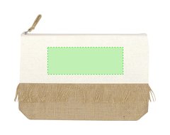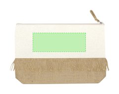 Neceser en combinación de yute laminado y algodón natural. Con distintivos flecos, cierre de cremallera en color natural y tirador de yute.