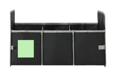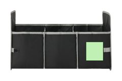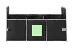 Organizador plegable fabricado en poliéster RPET 600D. Ideal para el maletero del coche. Con asas de transporte reforzadas, bolsillo frontal de malla en color gris y cintas en los laterales de velcro para mejor ajuste. Interior con tres compartimentos de almacenaje. El material RPET se elabora a partir de plástico reciclado, para así fomentar la reutilización de residuos plásticos y ayudar a la sostenibilidad del planeta.