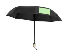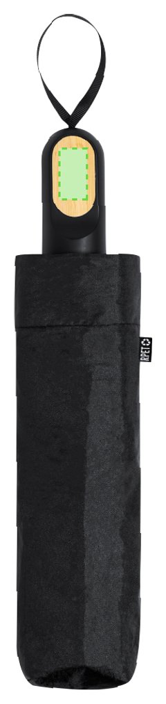 Paraguas plegable de 97cm de diámetro. En material pongee 190T RPET. De apertura manual, con sistema anti viento y varillas fabricadas en fibra de vidrio. Mango ergonómico con elegante detalle en bambú, fácil transporte gracias a su cordón, funda y cierre con velcro a juego. Con etiqueta distintiva RPET. Presentado en bolsa individual reciclada. El material RPET se elabora a partir de plástico reciclado, para así fomentar la reutilización de residuos plásticos y ayudar a la sostenibilidad del planeta.