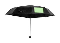 Paraguas plegable de 98cm de diámetro. En material pongee 190T RPET. De apertura manual, con sistema anti viento y varillas fabricadas en fibra de vidrio. Con mango ergonómico con práctica asa metálica de transporte, funda de transporte a juego y cierre con velcro a juego. Con etiqueta distintiva RPET. Presentado en bolsa individual reciclada. El material RPET se elabora a partir de plástico reciclado, para así fomentar la reutilización de residuos plásticos y ayudar a la sostenibilidad del planeta.