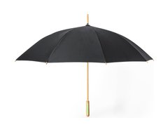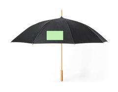 Paraguas de 140cm de diámetro en material pongee 190T RPET. Apertura manual y varillas de fibra de vidrio antiviento, de elegante color negro con cierre de velcro. Mango recto hecho en bambú y etiqueta distintiva RPET. El material RPET se elabora a partir de plástico reciclado, para así fomentar la reutilización de residuos plásticos y ayudar a la sostenibilidad del planeta.