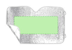 Parasol en aluminio con burbuja en ambas caras en color plateado de acabado metalizado con ribetes en color negro. De tamaño 130x80cm, con argollas metálicas de refuerzo, cintas elásticas para plegado, dos ventosas para ajuste en luna y presentación desplegado en plancha para fácil impresión.