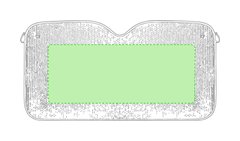 Parasol en aluminio a una cara en color plateado de acabado metalizado con ribetes de poliéster en color negro. De tamaño 130x70cm y espuma en el reverso. Cintas elásticas de plegado con argollas metálicas de refuerzo, dos ventosas para ajuste en luna y presentación desplegado en plancha para fácil impresión.